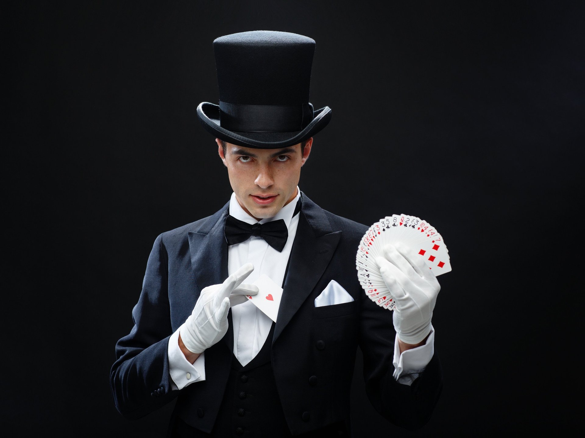 A good magician masters sleight of hand and misdirection. A wave of the white-tipped wand at the top hat captures your attention, as your pre-selected card is lifted from concealment to appear from – or disappear into – the inverted top hat.